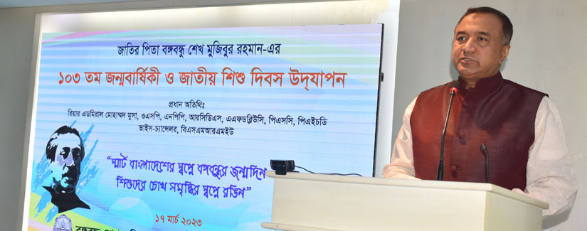 The Birth Anniversary of Father of the Nation Bangabandhu Sheikh Mujibur Rahman and National Children’s Day-2023 was celebrated by Bangladesh Maritime University. The Vice Chancellor of the University, Rear Admiral Mohammad Musa graced the occasion as the Chief Guest. The Treasurer, Registrar, Deans, Faculty members, Officers, Staff and Students of the university attended the function.