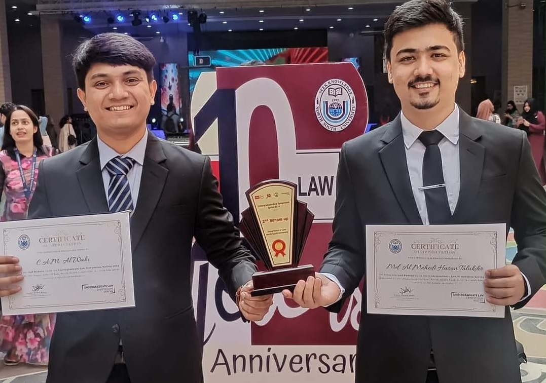 BMU Team was awarded 2nd runner-up in the Undergraduate Law Symposium held at North South University recently. Two LLB-2 students Al Wahi and Al Mehedi Hasan Talukder represented BMU in the competition. Undergraduate students from various universities of the country participated in the Undergraduate Law Symposium 2024.