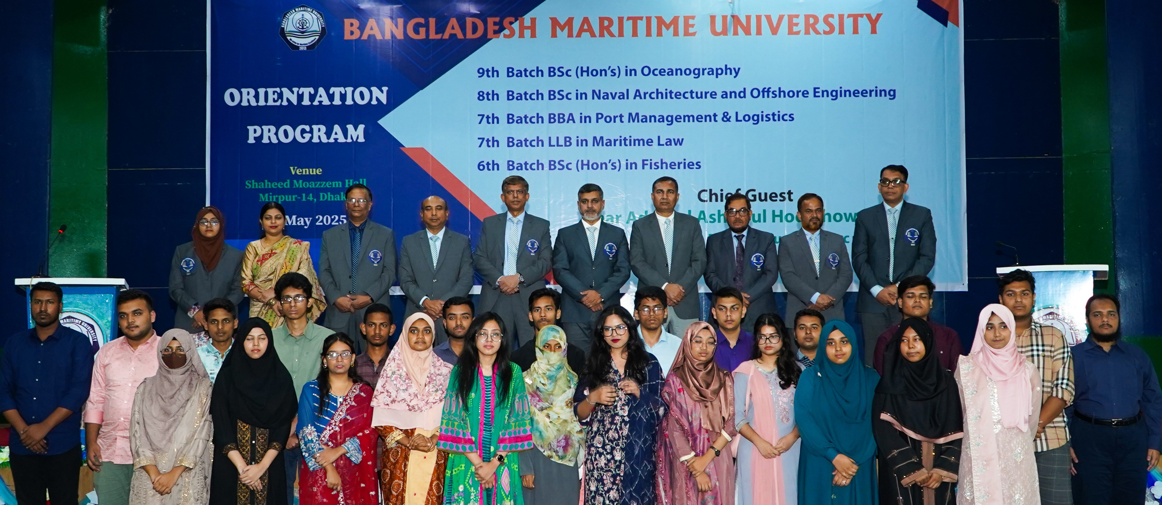 The orientation of new students for the 2024-2025 academic sessions held at Bangladesh Maritime University, a maritime specialized public university in the country on 04 May, 2025, at Shahid Moazzem Hall of BN College located in Mirpur-14, Dhaka. The orientation was attended by the university's 9th batch of BSc (Hons) in Oceanography, 8th batch of BSc in Naval Architecture and Offshore Engineering, 7th batch of BBA in Port Management and Logistics, 7th batch of LLB in Maritime Law and 6th batch of BSc in Fisheries students. The Honorable Vice-Chancellor of the university Rear Admiral Ashraful Hoq Chowdhury, NBP, OSP, BCGM, ndu, afwc, psc graced the occasion as the chief guest. The guardians of new students, Treasurer, Registrar, Deans of Faculties, Academic Advisor, Senior Professors, Faculty Members, Directors, Officers and Employees also present at the event. The Registrar of the university Commodore Mohammad Ehsanullah Khan delivered the welcome speech at the event. At the fresher reception, the university's Cultural Club performed the national anthem, a video documentary on the university was screened, different lecture sessions on providing guidance on rules and regulations, security, examination rules, financial matters, use of educational software, online library access and various other topics arranged at the orientation ceremony. At the ceremony the new students expressed joy and deep excitement for getting the opportunity to enroll in this specialized university and their parents expressed deep satisfaction with the bright future prospects for their children. In addition to the opportunities for maritime higher education they also expressed satisfaction with the assurance of a disciplined and safe environment under the overall supervision of the armed forces including Bangladesh Navy.