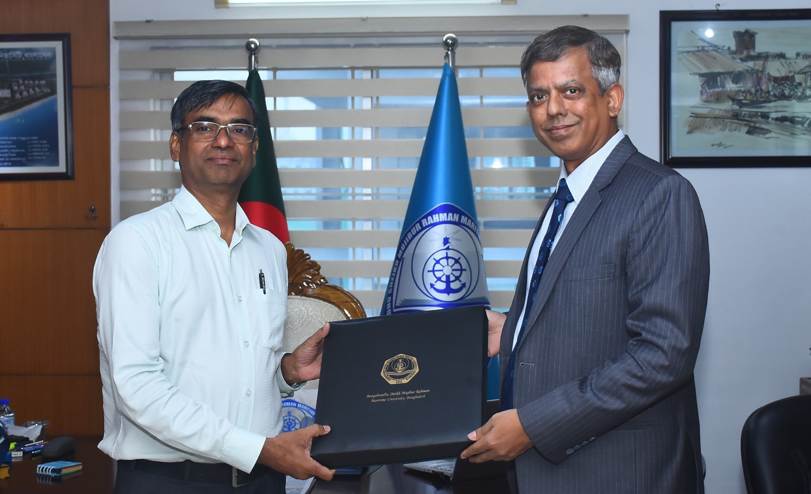 The Honorable Member of the University Grants Commission of Bangladesh Professor Dr. Mohammad Anwar Hossen has visited the temporary campus of Bangladesh Maritime University, Bangladesh at Pallabi, Mirpur-12, Dhaka at 1530 hrs on 05 November 2024. During his visit, he has attended at a briefing session on the requirement of extra rented building spaces to expand the academic & administrative activities and also the residential opportunities of the students of the university. The Honorable Vice Chancellor of the university Rear Admiral Ashraful Hoq Chowdhury, NBP, OSP, BCGM, ndu, afwc, psc accompanied with the Honorable Member of the UGC during the visit. During his visit, the Honorable Member being able to know how the university has been performing in the limited space and he assured the university authority to take the necessary actions for the approval of getting another rented building/spaces very soon.